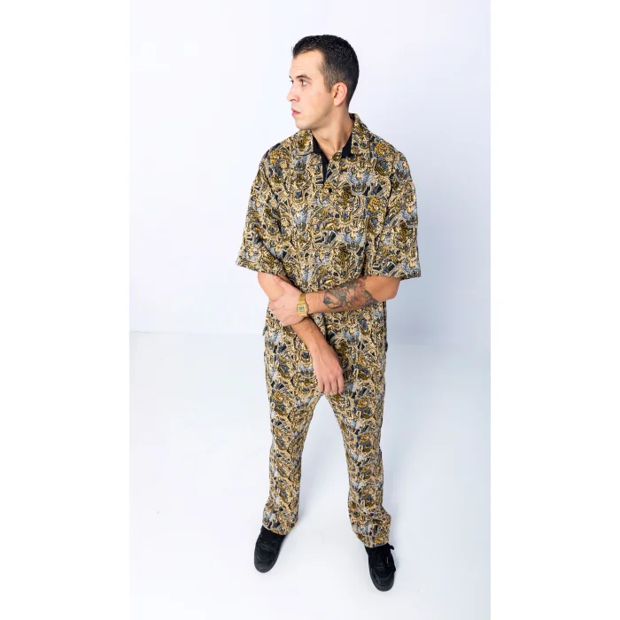It is jacquard and loose-fitting. It has a wild theme pattern with gold and black details.