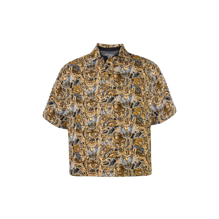 It is jacquard and loose-fitting. It has a wild theme pattern with gold and black details.