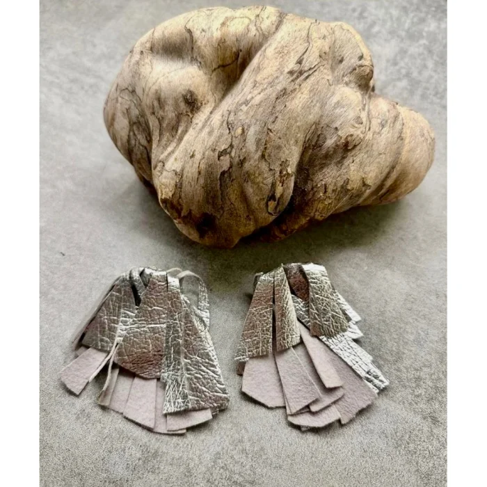Designed and hand made in London, these lightweight earrings are made with the softest metallic in a matt silver leather. Nickel free silver plated earring stud.
