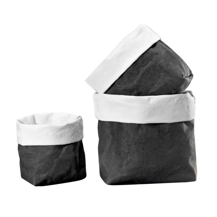 The paper bags can be folded and put aside. Recycable, washable papers. Water-resistant and tear-resistant. Small: h.16cm, Medium: h.19cm, Large: h.23cm.