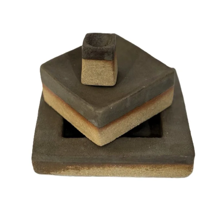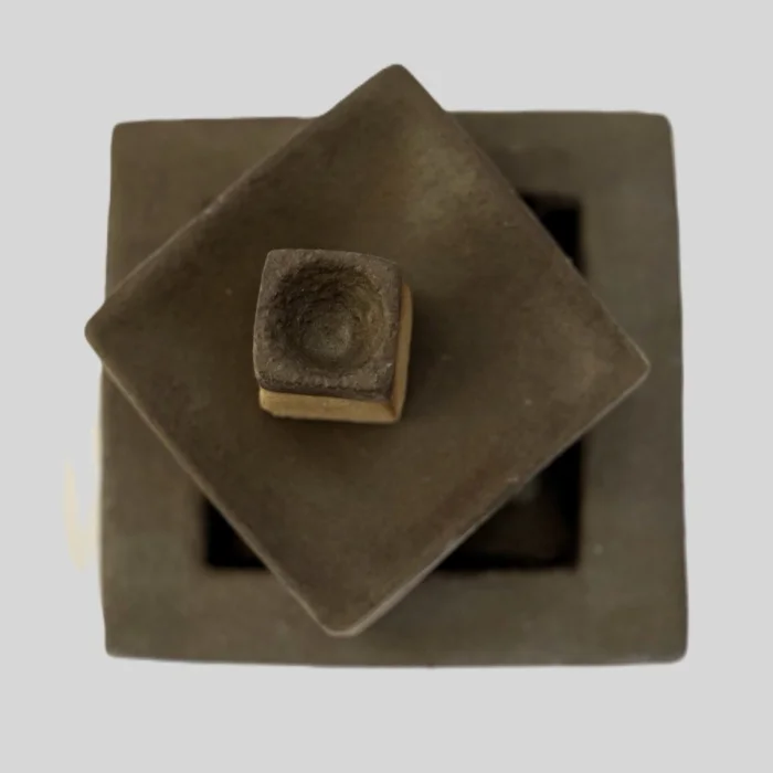 It consists of 2 square presentation plates and a small cup. Glaze is used in earth tones to reflect the tones of nature.