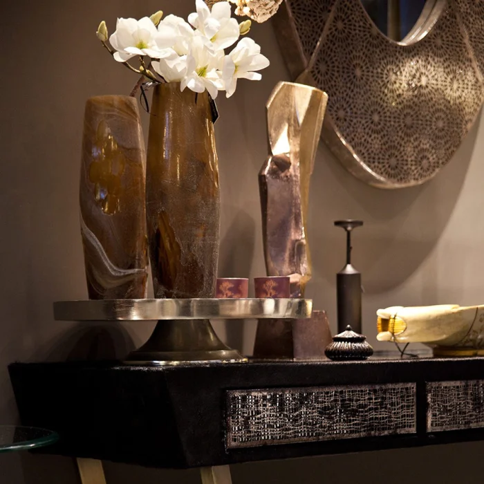 Care: Care for your accessories by dust in regularly with a soft cloth, clean by using a dry or slightly damp soft cloth follow by polishing with a dry soft cloth. Do not use commercial polished or waxes as they can damage finishes. You may wash them with water and dry immediately with a soft cloth. Do not leave water in your metal or painted glass accessories as it can cause lacquers and paints to lift. If there is a need for water for fresh flowers use plastic or glass container or bottle inside the metal vase or bowl to protect the surface.