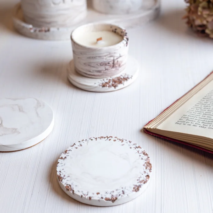 Made of handmade stone powder, the set of 4 coasters, which stands out with its crystal glass details, is offered with stylish packaging.