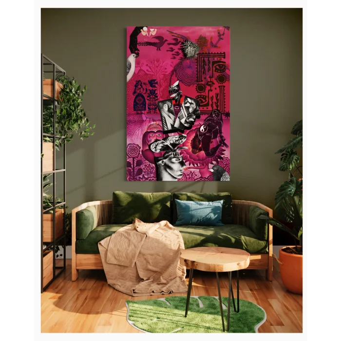 "This painting depicts a dream world in which a man with his eyes closed flies freely, accompanied by a mysterious woman who carries a yin-yang symbol. The man's wings, decorated with colorful bird feathers, sparkle as a symbol of freedom, while the yin-yang symbol burning in the woman's hands represents balance and harmony. In the background, an endless sea and sky create a timeless atmosphere. The woman's eyes bear the marks of her search for inner balance, while the man's face reflects the expression of his peaceful dream journey. While this painting tells a story that pushes the boundaries of imagination, it also presents a story of inner balance and search. It invites the viewer to join the journey of finding balance in their inner world. It is waiting for you to explore this magical world in your own living space." - "This painting reflects a dream world where a man with closed eyes soars freely, accompanied by a mysterious woman holding a yin-yang symbol. The man's wings, adorned with vibrant bird feathers, shimmer as a symbol of freedom, while the yin-yang symbol ablaze in the woman's hands represents balance and harmony. In the background, an infinite sea and sky create a timeless atmosphere. The woman's eyes bear traces of her quest for inner balance, while the man's face reflects the expression of a peaceful dream journey. This painting tells a captivating story that pushes the boundaries of imagination, while also presenting a narrative of inner balance and search. It invites the viewer to embark on a journey of finding balance within their own inner world. It awaits you to explore this enchanting world within your own living space."