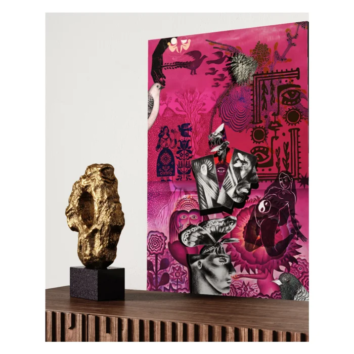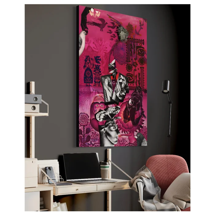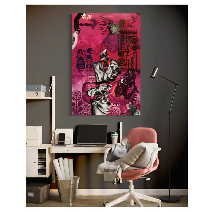 "This painting depicts a dream world in which a man with his eyes closed flies freely, accompanied by a mysterious woman who carries a yin-yang symbol. The man's wings, decorated with colorful bird feathers, sparkle as a symbol of freedom, while the yin-yang symbol burning in the woman's hands represents balance and harmony. In the background, an endless sea and sky create a timeless atmosphere. The woman's eyes bear the marks of her search for inner balance, while the man's face reflects the expression of his peaceful dream journey. While this painting tells a story that pushes the boundaries of imagination, it also presents a story of inner balance and search. It invites the viewer to join the journey of finding balance in their inner world. It is waiting for you to explore this magical world in your own living space." - "This painting reflects a dream world where a man with closed eyes soars freely, accompanied by a mysterious woman holding a yin-yang symbol. The man's wings, adorned with vibrant bird feathers, shimmer as a symbol of freedom, while the yin-yang symbol ablaze in the woman's hands represents balance and harmony. In the background, an infinite sea and sky create a timeless atmosphere. The woman's eyes bear traces of her quest for inner balance, while the man's face reflects the expression of a peaceful dream journey. This painting tells a captivating story that pushes the boundaries of imagination, while also presenting a narrative of inner balance and search. It invites the viewer to embark on a journey of finding balance within their own inner world. It awaits you to explore this enchanting world within your own living space."