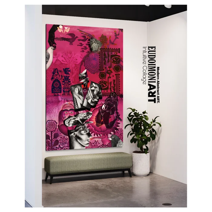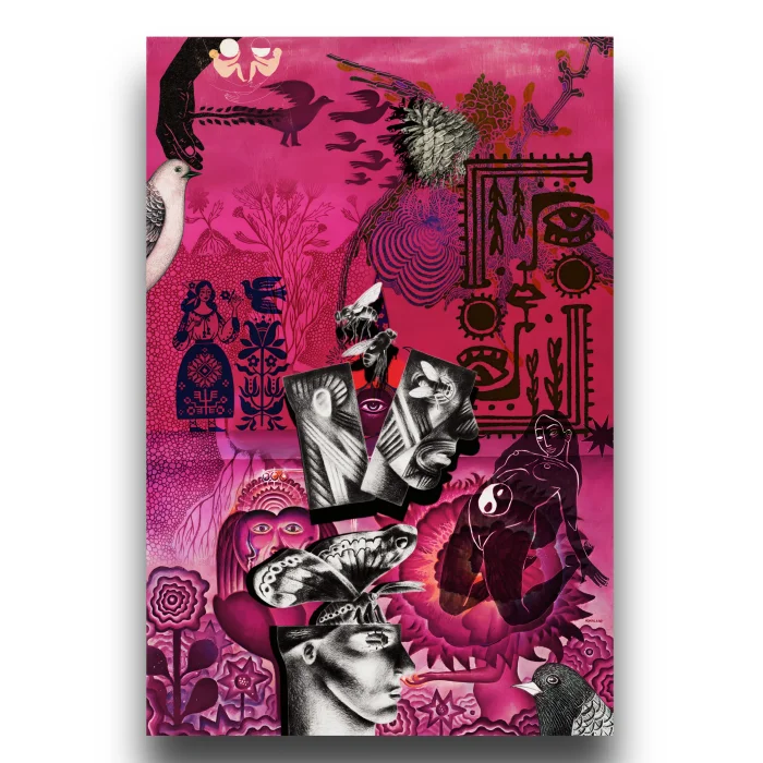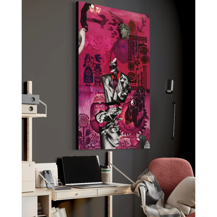 "This painting depicts a dream world in which a man with his eyes closed flies freely, accompanied by a mysterious woman who carries a yin-yang symbol. The man's wings, decorated with colorful bird feathers, sparkle as a symbol of freedom, while the yin-yang symbol burning in the woman's hands represents balance and harmony. In the background, an endless sea and sky create a timeless atmosphere. The woman's eyes bear the marks of her search for inner balance, while the man's face reflects the expression of his peaceful dream journey. While this painting tells a story that pushes the boundaries of imagination, it also presents a story of inner balance and search. It invites the viewer to join the journey of finding balance in their inner world. It is waiting for you to explore this magical world in your own living space." - "This painting reflects a dream world where a man with closed eyes soars freely, accompanied by a mysterious woman holding a yin-yang symbol. The man's wings, adorned with vibrant bird feathers, shimmer as a symbol of freedom, while the yin-yang symbol ablaze in the woman's hands represents balance and harmony. In the background, an infinite sea and sky create a timeless atmosphere. The woman's eyes bear traces of her quest for inner balance, while the man's face reflects the expression of a peaceful dream journey. This painting tells a captivating story that pushes the boundaries of imagination, while also presenting a narrative of inner balance and search. It invites the viewer to embark on a journey of finding balance within their own inner world. It awaits you to explore this enchanting world within your own living space."