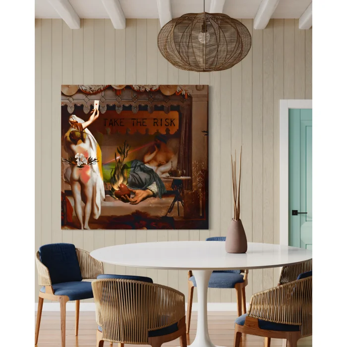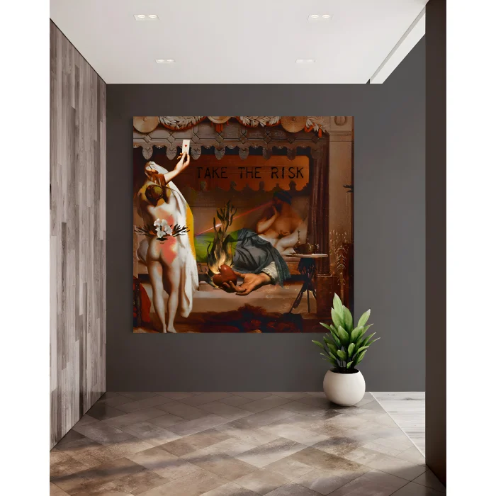 It's titled "Risk: A Dance on the Borders of Love." This work reflects how the steps people take in life are closely related to the risks they face and the love they feel inside. At a glance, we see two figures in our painting: one making a bold leap while the other watches with an eye on it. This symbolizes the double dance of risk and love. The person who takes the bold step takes the risk with their belief in love and new experiences, while the person next to them represents support and trust. This interaction between the two figures describes how to deal with the risks encountered in relationships and in life. Colors also complete this story. The figure of the brave person, surrounded by a passionate red, is a symbol of love and passion. The other person is surrounded by calm and serene shades of blue, a symbol of trust and balance. "Risk: A Dance on the Borders of Love" reminds us how important it is to take risks and experience love in order to understand the complexity and beauty of life. This painting calls on the viewer to discover the power of courage and love. Sometimes taking risks makes us feel love and life more deeply. We must find the courage within ourselves and challenge the risks to seize the opportunities that life offers. With "Risk: A Dance on the Borders of Love", we can take bold steps like the figures in the painting and embark on a journey towards the opportunities that life offers. This work reminds us of how risk and love dance together and gives the audience the courage to participate in this dance. Love. ---Our artwork is titled "Risk: A Dance on the Edge of Love." This piece reflects how the steps we take in life are closely intertwined with the risks we encounter and the love we feel. At first glance, you can see two figures in our painting: one is bravely taking a leap while the other watches, providing protection. This symbolizes the intricate dance between risk and love. The individual taking the bold step is risking it all with a belief in love and new experiences, while the one beside them represents support and trust. The interaction between these two figures tells a story of how we deal with risks in relationships and life. Colors play an essential role in completing this narrative. The figure taking the daring step is surrounded by passionate shades of red, representing love and passion. Meanwhile, the other person is enveloped in calm and serene shades of blue, signifying trust and balance. "Risk: A Dance on the Edge of Love" reminds us of the significance of taking risks and experiencing love to understand the complexities and beauty of life. This painting calls on the viewer to discover the power of courage and love. Sometimes, taking risks allows us to feel love and life more deeply. We should find the courage within us and challenge ourselves to seize the opportunities that life offers. With "Risk: A Dance on the Edge of Love," just like the figures in the painting, we can embark on a journey toward the opportunities life presents by taking courageous steps. This artwork reminds us of how risk and love dance together and encourages viewers to join in this dance.