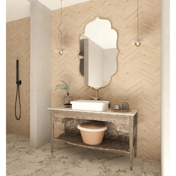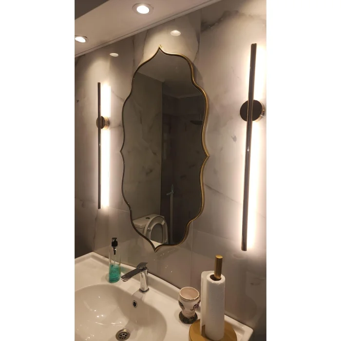 This mirror features an asymmetrical design with a slightly curved edge, giving it a modern and sleek look.