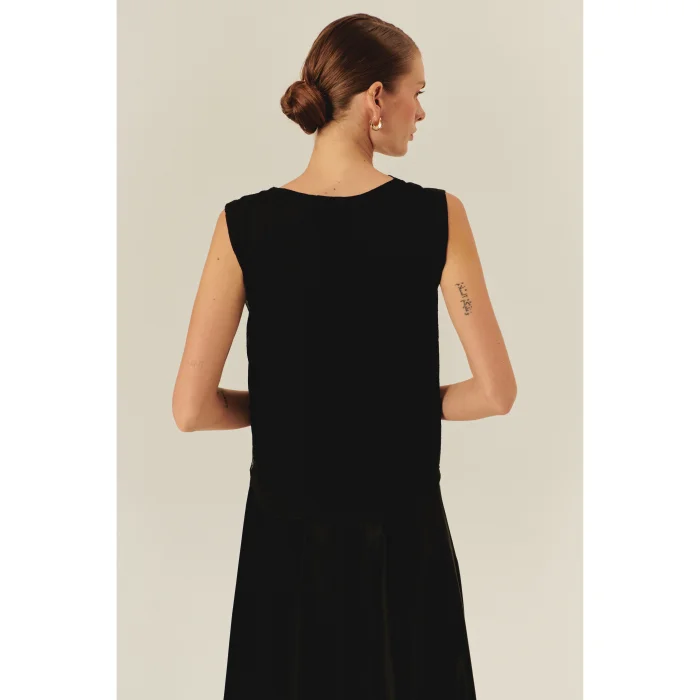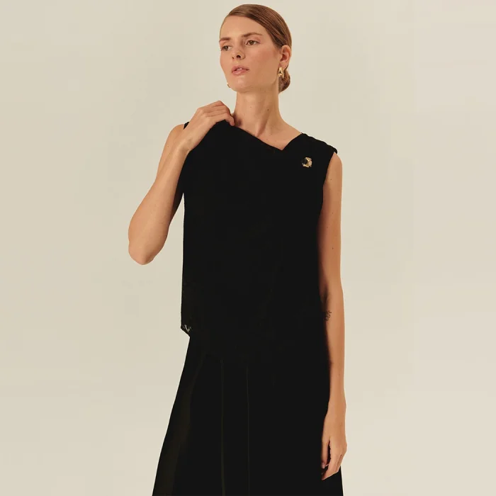 The striking power of minimalism! The asymmetrical neckline detail interprets the classic black blouse with a modern touch, while the sleeveless cut offers an elegant and free silhouette. The regular fit pattern provides comfort all day long by fitting comfortably on the body, while the fluid fabric accompanies your movement. Easily adaptable from day to night, this blouse is ideal for creating a timeless office style with stylish trousers, a romantic touch with pleated skirts, or casual elegance with denims.
