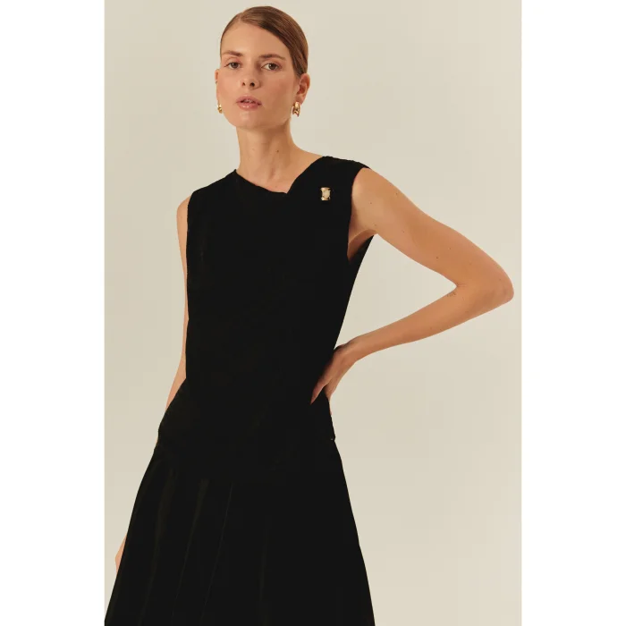 The striking power of minimalism! The asymmetrical neckline detail interprets the classic black blouse with a modern touch, while the sleeveless cut offers an elegant and free silhouette. The regular fit pattern provides comfort all day long by fitting comfortably on the body, while the fluid fabric accompanies your movement. Easily adaptable from day to night, this blouse is ideal for creating a timeless office style with stylish trousers, a romantic touch with pleated skirts, or casual elegance with denims.