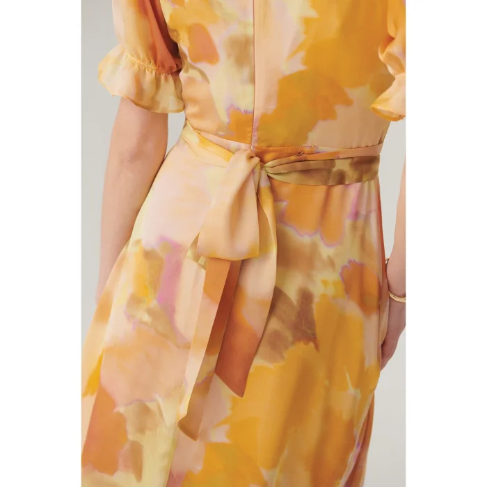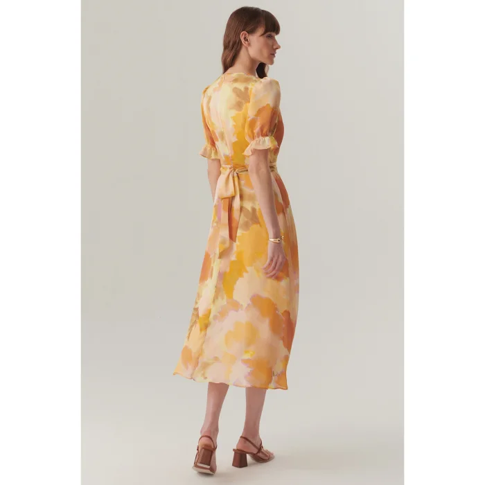 Creating an energetic effect with its abstract patterns, this midi length dress offers a feminine silhouette with its crewneck and balloon sleeve design. Its waist-fitting cut elegantly highlights your body, while its soft texture promises comfort all day long. This dress adapts to your every moment, making your style stand out.