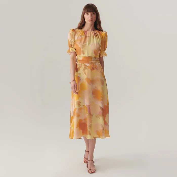 Creating an energetic effect with its abstract patterns, this midi length dress offers a feminine silhouette with its crewneck and balloon sleeve design. Its waist-fitting cut elegantly highlights your body, while its soft texture promises comfort all day long. This dress adapts to your every moment, making your style stand out.