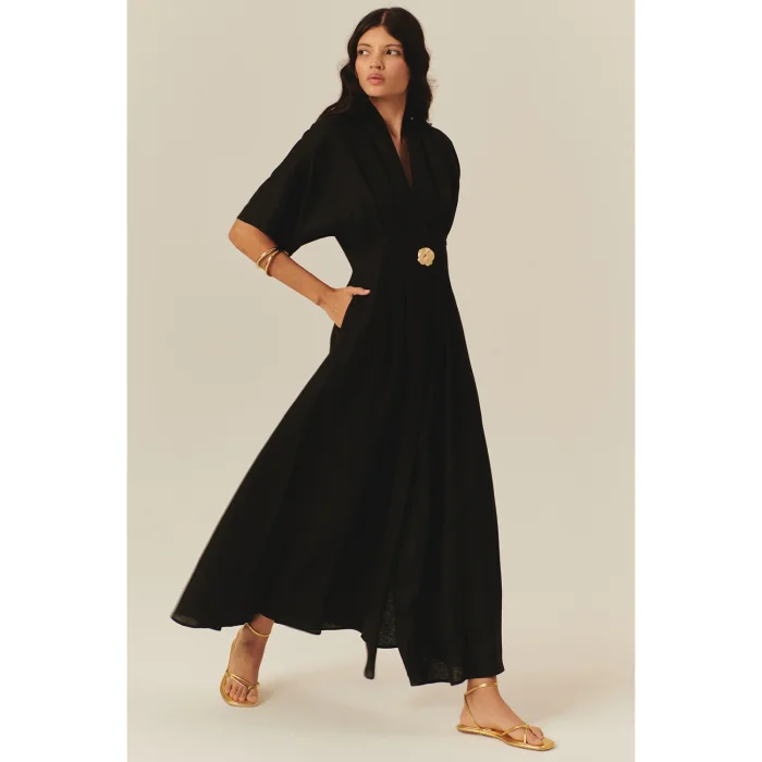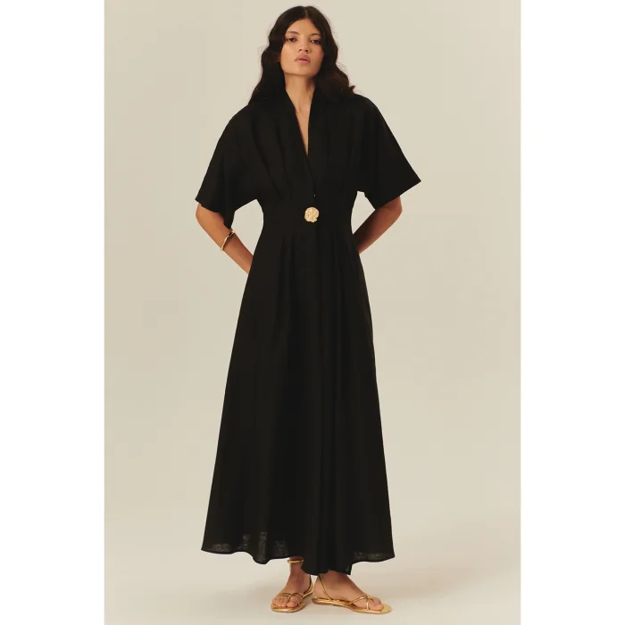 Standing out with its elegant silhouette and strong details, the black A-line midi dress with button details offers a modern and sophisticated stance. Its waist-fitting cut elegantly emphasizes the body lines, while its fluid form provides freedom of movement. The V-neck and gold button detail add a modern touch to the design, while the wide cut short sleeves give the dress a light and relaxed silhouette. While the A-line midi length adapts to both day and evening combinations, it creates a timeless elegance when complemented with gold-colored accessories.This dress, which adapts to any environment from the city to holiday getaways, reflects the original and confident style of the Exquise woman.