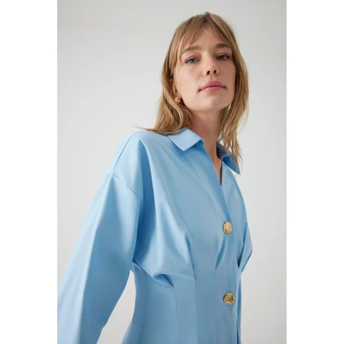Combining elegance and comfort, the Waist-Fitting Button Detailed Cotton Midi Shirt Dress offers comfort all day long with its natural cotton fabric. The button details on the front and the waist-fitting cut create an elegant and modern silhouette. This dress, which you can choose for both business and daily use, adds a sophisticated touch to your style. It is a regular pattern.