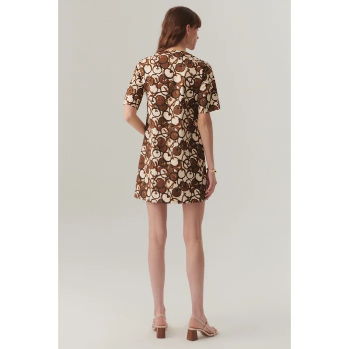 Standing out with its vibrant patterns, this mini dress offers a modern and comfortable silhouette thanks to its crew neck and short sleeve design. Its front-buttoned detail provides a practical use, while its striking print adds an energetic atmosphere to your style.