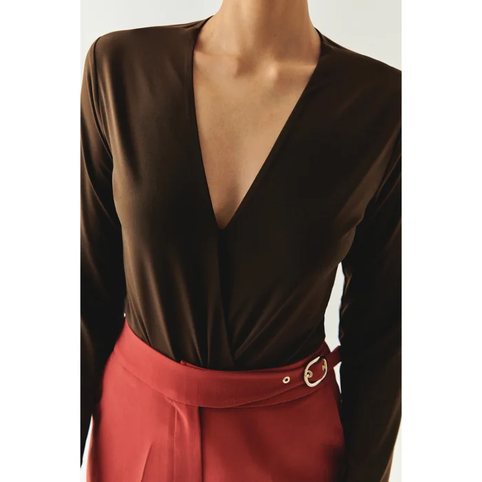 This blouse, which makes you feel comfortable all day long with its soft and flexible knitted texture, offers a feminine elegance with its deep V-neck design; Thanks to its long sleeves, it is a timeless piece that is ideal for seasonal transitions and harmonizes with every combination from office style to evening meetings.