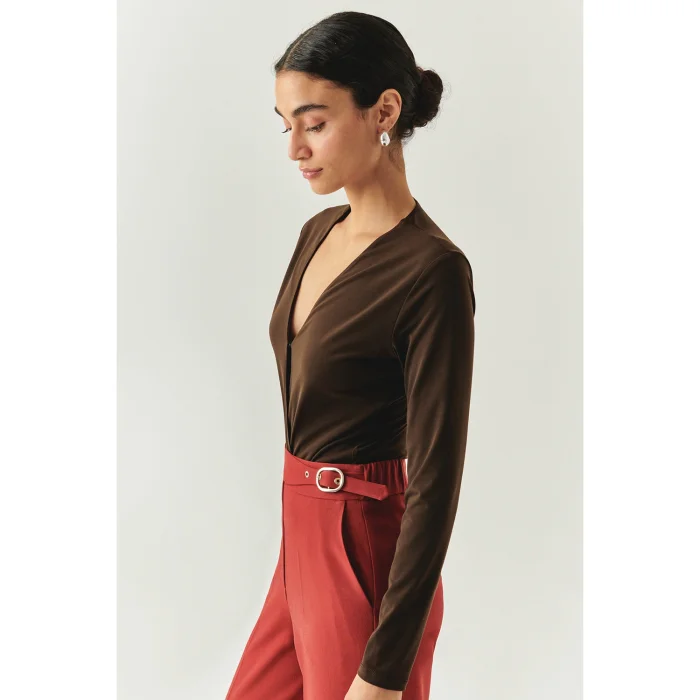 This blouse, which makes you feel comfortable all day long with its soft and flexible knitted texture, offers a feminine elegance with its deep V-neck design; Thanks to its long sleeves, it is a timeless piece that is ideal for seasonal transitions and harmonizes with every combination from office style to evening meetings.