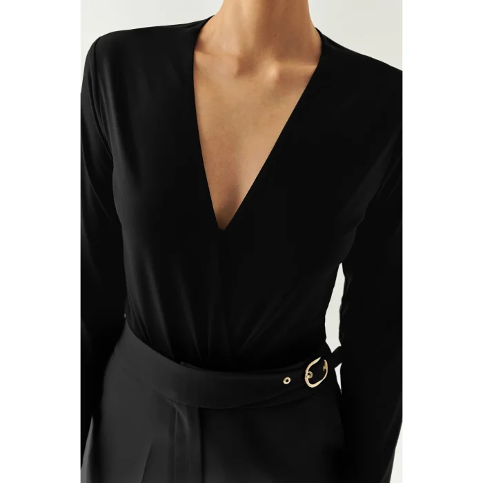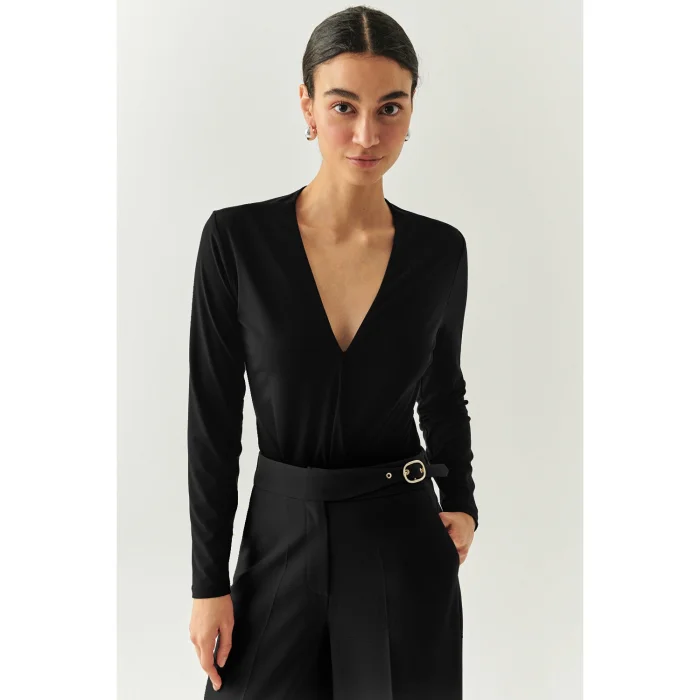 This blouse, which makes you feel comfortable all day long with its soft and flexible knitted texture, offers a feminine elegance with its deep V-neck design; Thanks to its long sleeves, it is a timeless piece that is ideal for seasonal transitions and harmonizes with every combination from office style to evening meetings.