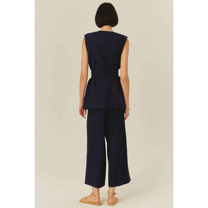 Emphasizing timeless elegance, this navy blue vest offers an eye-catching style with its textured fabric and gold button details. The belt at the waist adds an elegant movement to the slim fit cut, while the pockets meet functionality and elegance at the same time.