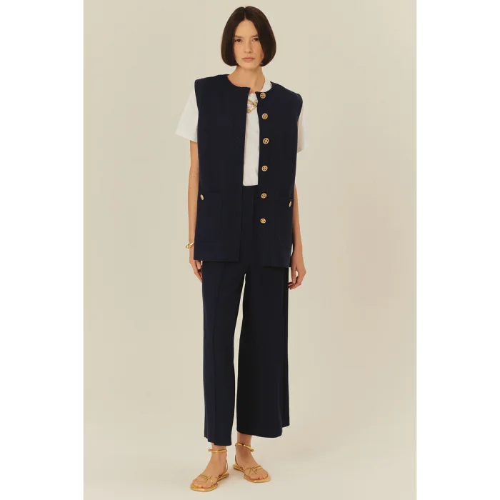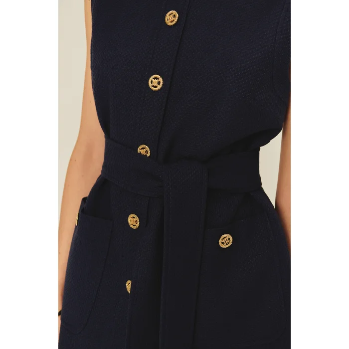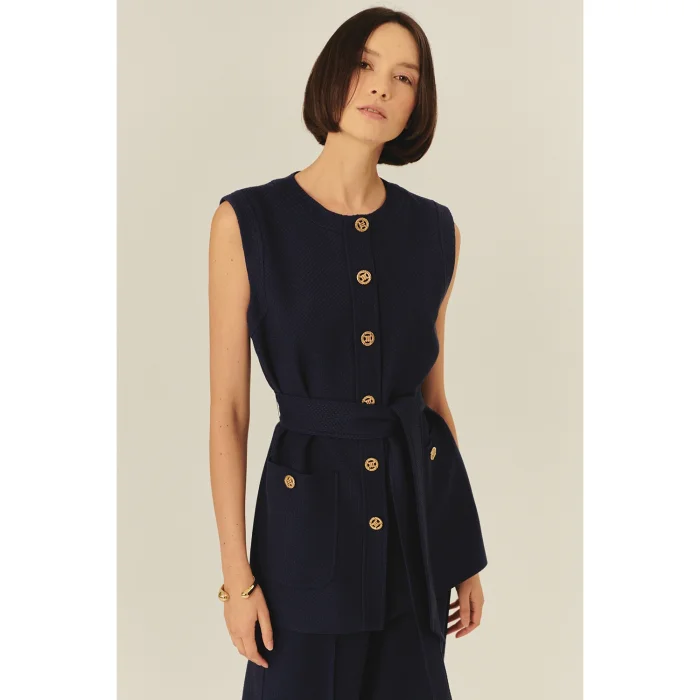 Emphasizing timeless elegance, this navy blue vest offers an eye-catching style with its textured fabric and gold button details. The belt at the waist adds an elegant movement to the slim fit cut, while the pockets meet functionality and elegance at the same time.