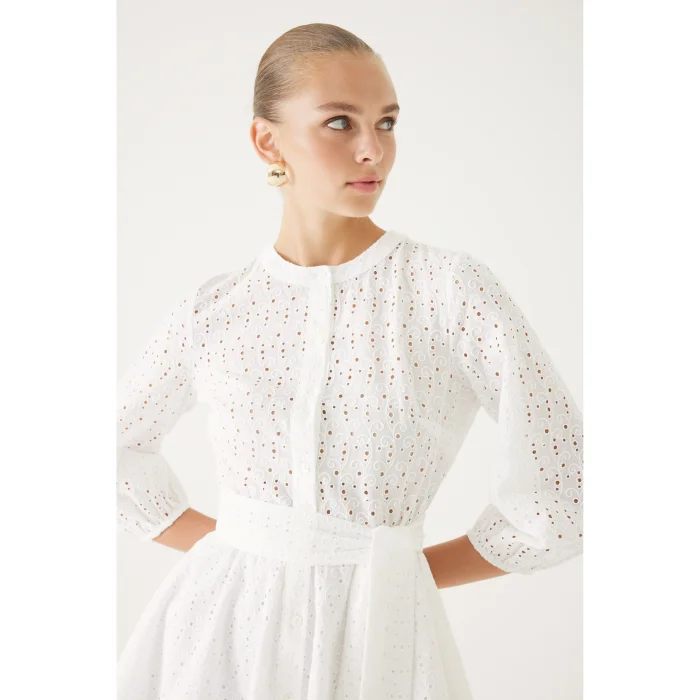 If you are looking for a piece that will reflect your elegance and freshness on the sparkling days of summer, the White Guipure Summer Mini Dress is for you! With its elegant guipure details and fresh cut, this dress is the perfect option to complete your style on hot days.