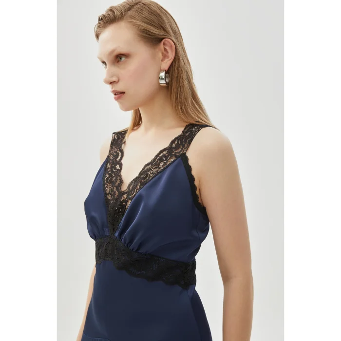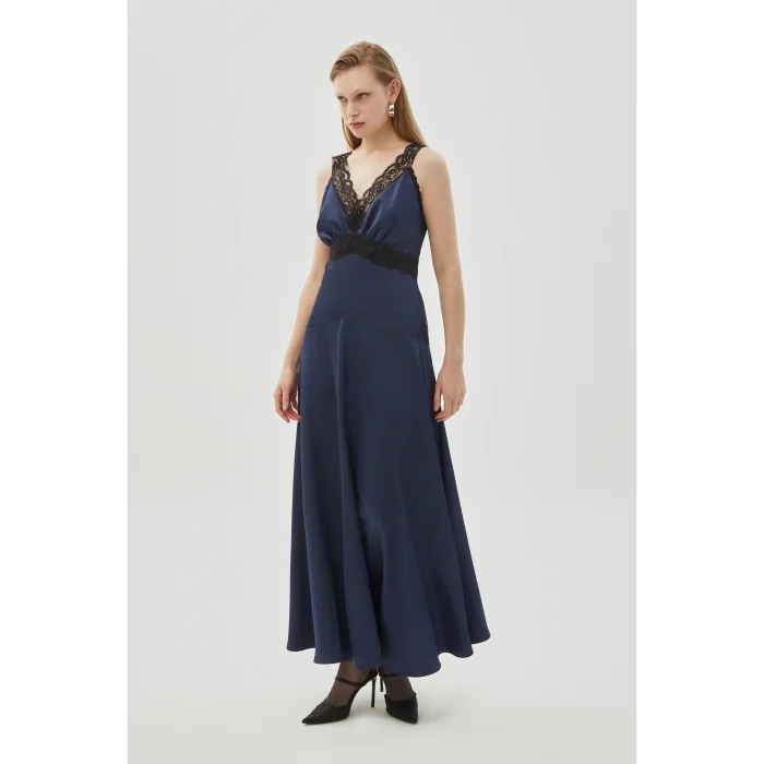 Ideal for an elegant and impressive look, the V-Neck Regular Maxi Dress with Lace Detail stands out with its sophisticated design. The V-neck and lace details add a romantic and stylish feel to the dress, while the navy blue color provides an elegant touch. Regular maxi length highlights your style both at special events and evening events.