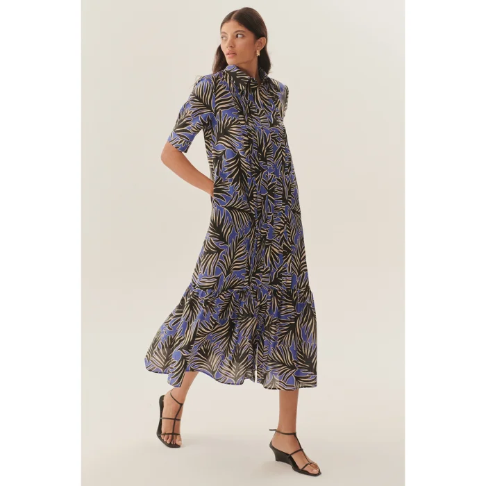 The Leaf Patterned Midi Dress, which is the key to an elegant and assertive style, is a stylish piece that you can use comfortably for both daily and special occasions. Leaf patterns in shades of black and beige combine with the vibrant blue background to create a modern and eye-catching look. With its buttoned front, classic collar and short sleeves, it provides both a stylish and comfortable use. The layered midi length skirt adds elegance to your movement while giving the body a nice draping. You can pair this dress with sandals for everyday elegance and with heels and elegant jewelry for special occasions.
