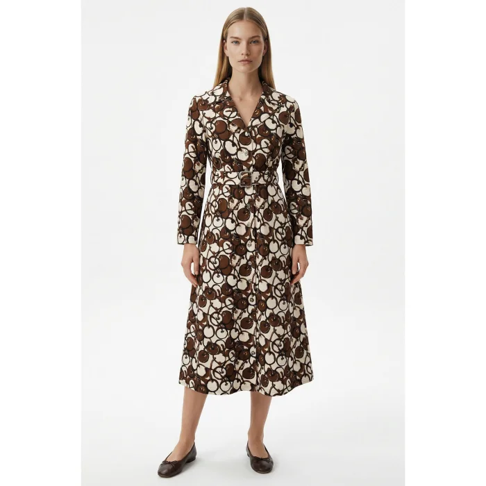 Offering a balanced silhouette with its classic shirt collar form and waist-fitting belt detail, this midi dress stands out with its timeless design. The button closure detail on the front makes it practical to use, while its long-sleeved structure provides ideal comfort during seasonal transitions. Thanks to its below-knee length, it offers both stylish and comfortable use. The patterned fabric adds movement to the dress, while the strap-on belt elegantly emphasizes the body form. Product Features Shirt collar Long sleeve Front button closure Waist tie belt detail Midi length Patterned fabric Comfortable and balanced fit