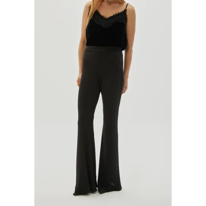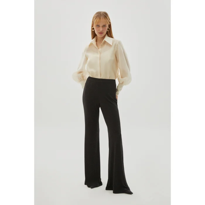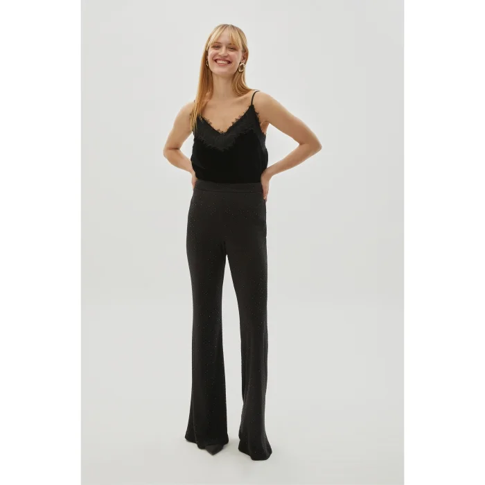 These slimfit black knitted trousers, which are stylish with their sequined details, offer a modern look with a spanish leg cut. Its soft and flexible fabric provides a comfortable use. It is a perfect choice for both casual and private occasions.