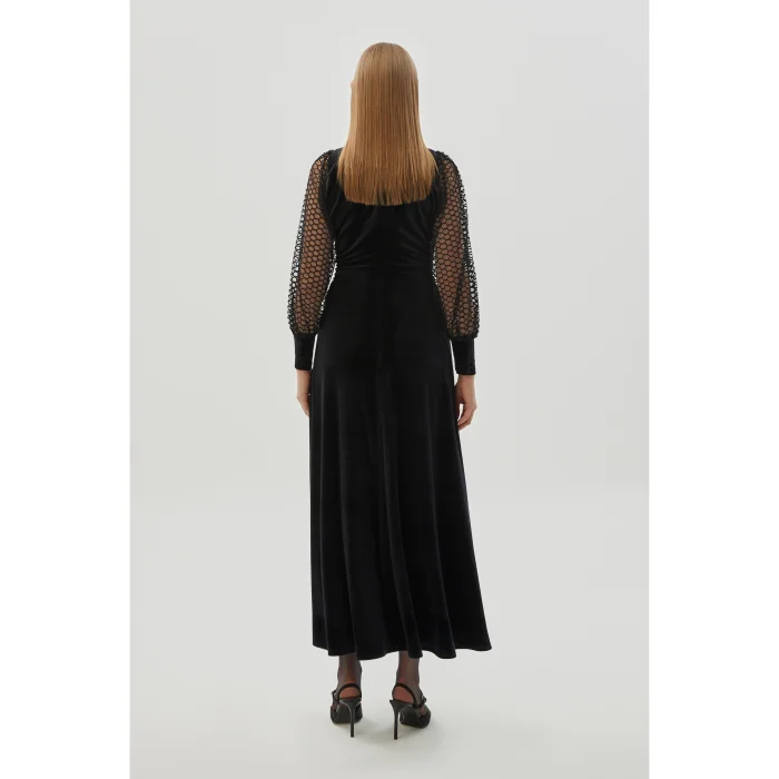 Offering an elegant and stylish look, the Lycra Lace Sleeve Detailed Midi Regular Velvet Black Dress stands out with the luxurious texture of its velvet fabric and lace sleeve details. Its lycra construction provides a comfortable fit, while the midi length creates a sleek silhouette. This dress enhances your elegance at both special occasions and evening events.