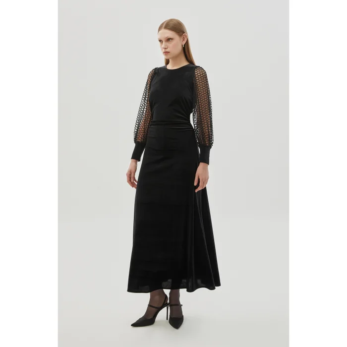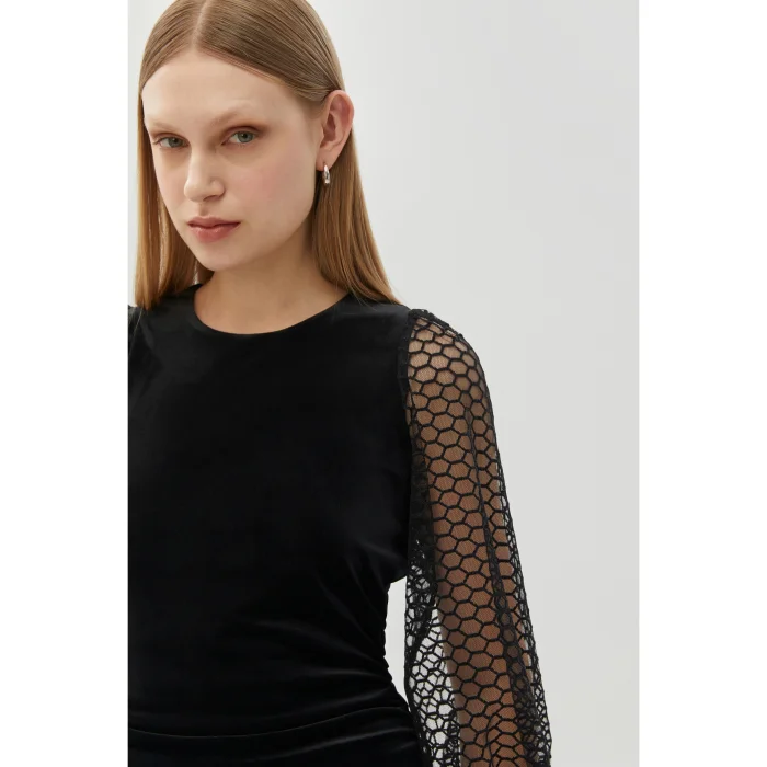 Offering an elegant and stylish look, the Lycra Lace Sleeve Detailed Midi Regular Velvet Black Dress stands out with the luxurious texture of its velvet fabric and lace sleeve details. Its lycra construction provides a comfortable fit, while the midi length creates a sleek silhouette. This dress enhances your elegance at both special occasions and evening events.
