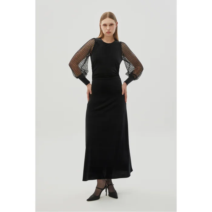Offering an elegant and stylish look, the Lycra Lace Sleeve Detailed Midi Regular Velvet Black Dress stands out with the luxurious texture of its velvet fabric and lace sleeve details. Its lycra construction provides a comfortable fit, while the midi length creates a sleek silhouette. This dress enhances your elegance at both special occasions and evening events.