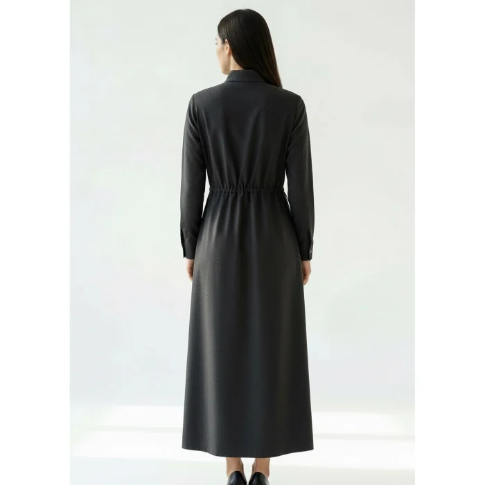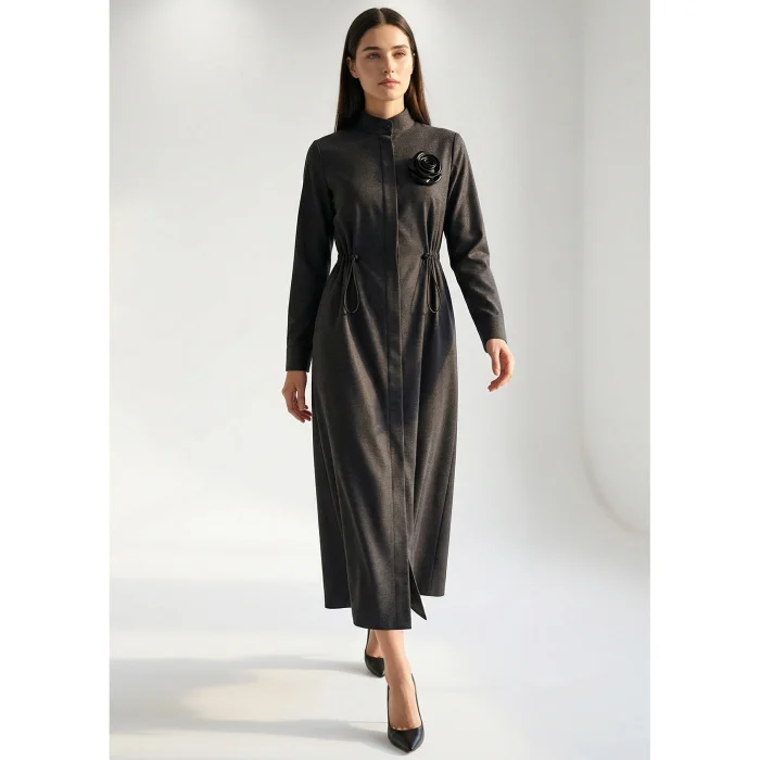 Designed in a straight and flowing form, this long dress offers comfortable elegance. The minimal button placket and raised collar detail on the front create a modern look, while the adjustable drawstring mechanism at the waist allows the silhouette to be shaped as desired. The decorative floral applique on the chest adds a touch of sophistication to the design. Thanks to its long-sleeved structure, it is a simple but characterful model suitable for use during seasonal transitions.