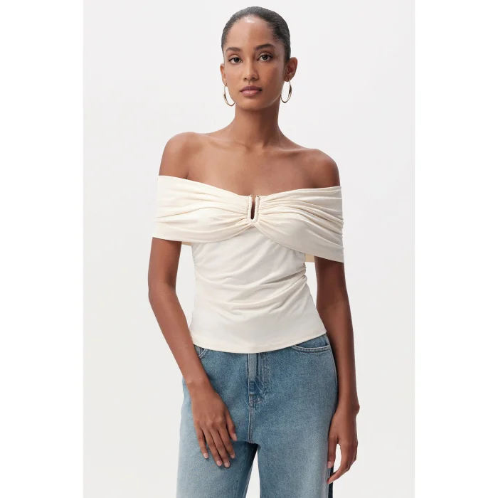 Slim Fit Knitted Cream Blouse with Off-the-Shoulder Metal Buckle is an ideal piece to have a special place in your wardrobe with its modern and stylish design. This blouse attracts attention with the soft texture offered by its knitted fabric and comfort that lasts all day long, while its slim fit cut creates a silhouette that elegantly emphasizes body lines. Cream color adapts to different styles with its structure that can be easily combined with bottom clothing products in both light and dark tones. The metal buckle detail on the front of the blouse adds a contemporary touch to the design, making the blouse more than an ordinary top and offering a unique style. Its off-the-shoulder design offers a feminine and elegant look, giving the product an attractive aesthetic. These features make the blouse preferred both for daily use and for special occasions. Whether you wear it with casual jeans and achieve everyday elegance, or combine it with a pencil skirt or stylish trousers in a more formal or private setting, this blouse offers versatile usage possibilities. Made from high quality knitted fabric, this blouse provides freedom of movement with its durability and flexible structure and is suitable for long-term use. With its gentle touch to the skin, it can also be preferred during seasonal transitions or cool evenings. Thanks to its slim fit cut, it is very easy to create layered combinations with outerwear pieces such as blazers, cardigans or leather jackets. The metal buckle detail and off-the-shoulder design make the blouse an indispensable choice for women who follow fashion and want to look stylish. You can always display an original and confident stance by creating different combinations with this specially designed blouse. Offering elegance and comfort together, this piece is a candidate to be one of the cornerstones of your wardrobe.