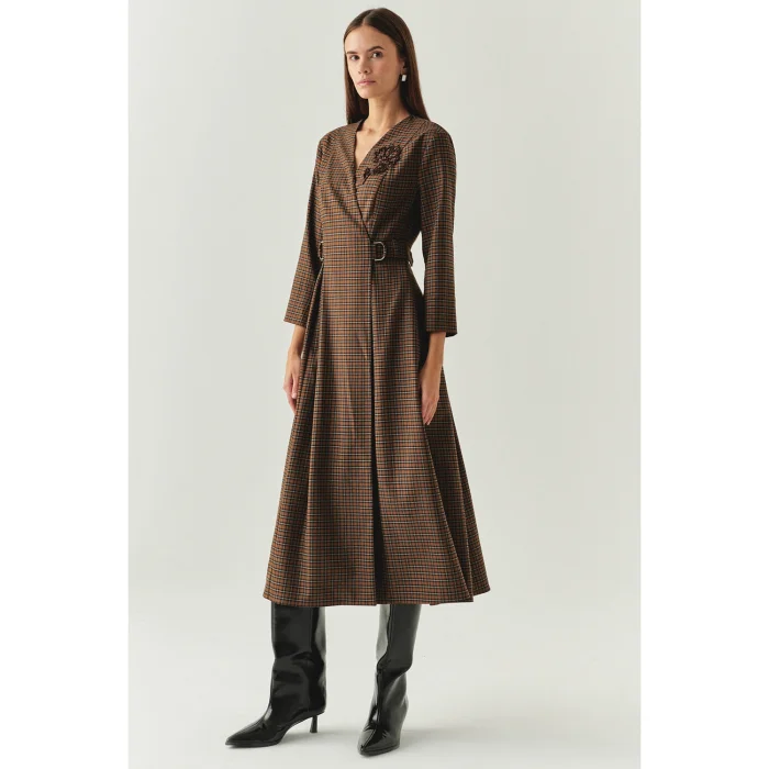 Offering a classic elegance with its checkered pattern and wrap cut, this midi dress elegantly emphasizes the silhouette with buckled belt details at the waist; Thanks to its slim fit form, it allows you to achieve a strong look with boots and a feminine look with stiletto heels.