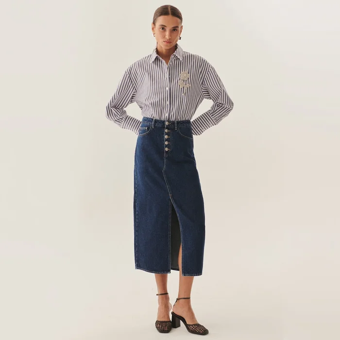 Combining elegant and modern lines, the Cotton Midi Denim Skirt with Button and Slit Detail is the perfect piece to add elegance to your daily combinations! This denim skirt, which offers both comfort and style with its high waist and front slit detail, provides a timeless look with its button-closure design. With its 100% cotton fabric, it allows your skin to breathe and offers a comfortable use all day long.