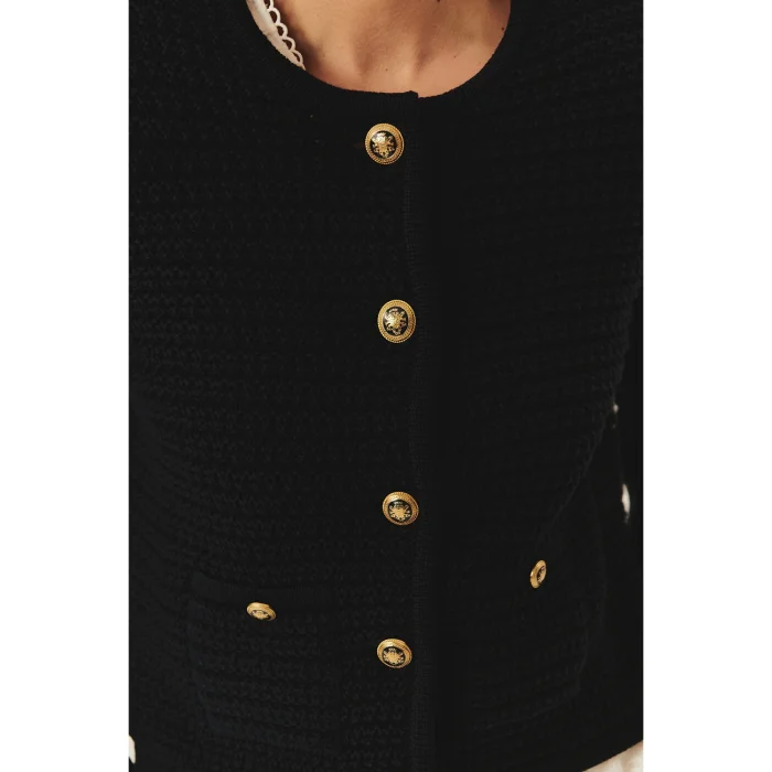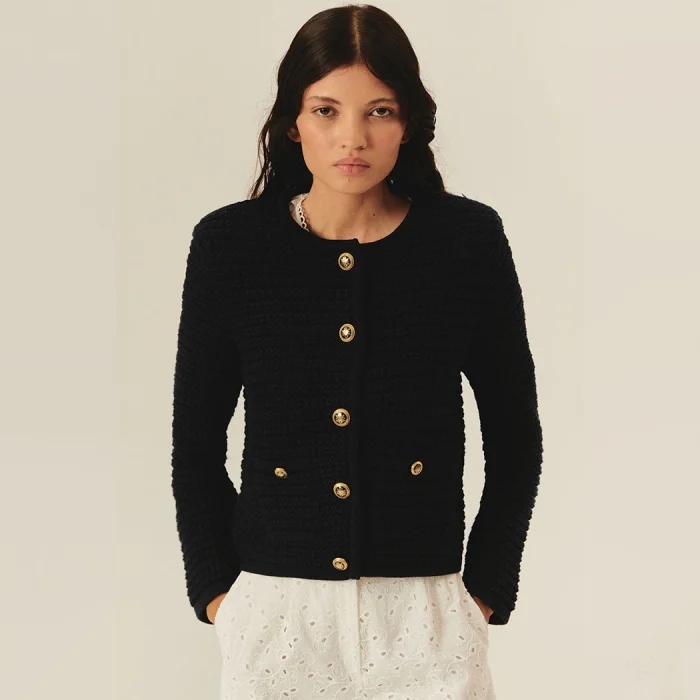 Standing out with its elegant and stylish details, the pure cotton navy blue regular knitwear cardigan with button details offers a design where classic style meets modern touches. While it offers a sophisticated look with its carefully crafted texture and gold-colored buttons, it provides comfort all day long thanks to its comfortable cut. The decorative pockets on the front add functionality to the elegance. This cardigan, which will be a perfect complement to both your office style and daily combinations, will be one of the indispensable parts of your closet with its timeless design.