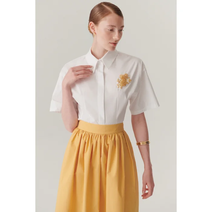 A sophisticated and elegant interpretation of the classic white shirt! The beading detail complements the minimal and sleek design with an artistic touch. The 100% pure cotton texture provides all-day comfort, while the regular fit cut offers a comfortable and modern silhouette. This special design is the perfect choice for creating an elegant look with high-waisted trousers, a romantic style with patterned skirts, or a casual elegance with jeans! It is destined to be one of the most timeless and special pieces of your wardrobe.