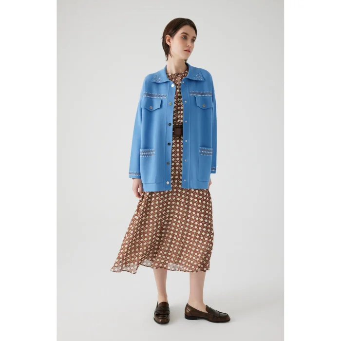 This regular cardigan, which stands out with its pocket and collar decorations with stone details that increase your elegance, offers an elegant and modern look. Providing comfort with its soft and comfortable knitwear fabric, this cardigan adds a touch of sophistication to any combination. An ideal choice for both daily use and special moments.