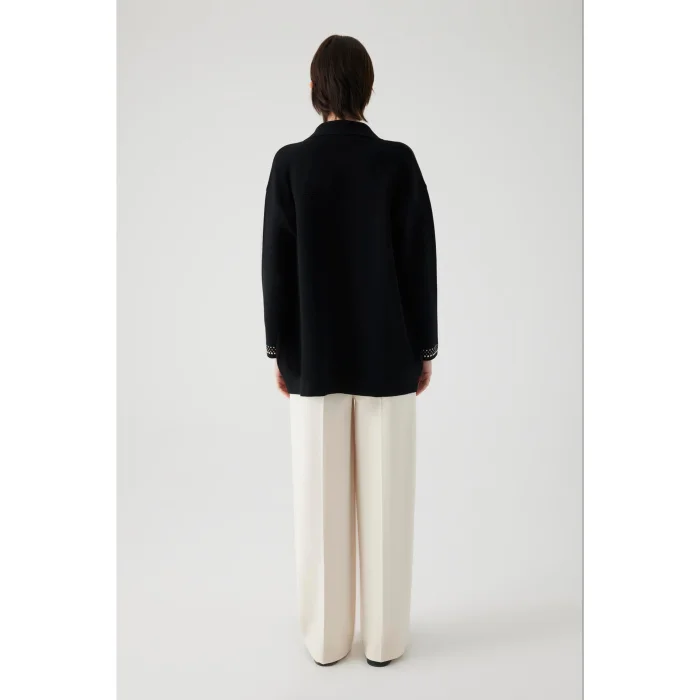 This regular cardigan, which stands out with its pocket and collar decorations with stone details that increase your elegance, offers an elegant and modern look. Providing comfort with its soft and comfortable knitwear fabric, this cardigan adds a touch of sophistication to any combination. An ideal choice for both daily use and special moments.