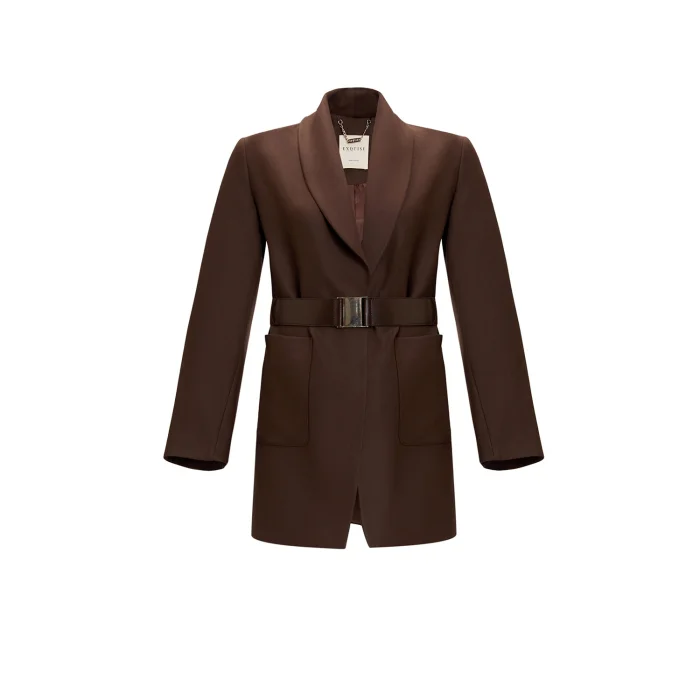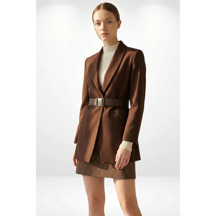 This stylish and modern jacket elegantly emphasizes the waist form thanks to its buckled belt, while offering a sophisticated look with its gold-toned button details. Its soft-textured fabric and comfortable cut provide comfort in daily and special combinations. With its large front pockets, this piece adds both style and functionality, making it a timeless option in your wardrobe.
