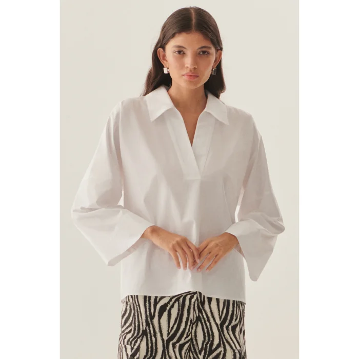 Offering a modern comfort with its comfortable fit and wide sleeve details, this white shirt adds freshness to every moment with its 100% pure cotton fabric. With its minimalist design and sleek stance, this piece combines comfort with elegance and adds an elegant touch to your everyday style. You can reflect your comfortable elegance by combining it with shorts or classic trousers. While it blends perfectly with both hot summer days and slightly cool evenings, the white shirt, which creates a stylish and functional option thanks to its natural texture, will be an indispensable part of your wardrobe.