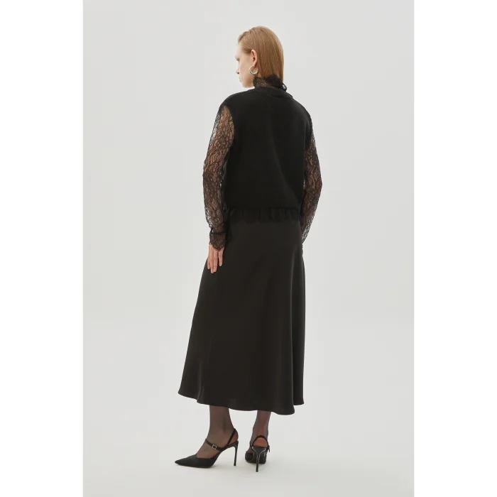 With its satin texture and lace details, this regular midi skirt combines elegance and elegance. As one of the sophisticated pieces in the 24 Fall/Winter collection, it is the perfect choice for both everyday and special moments. Add a modern and stylish touch to your style.