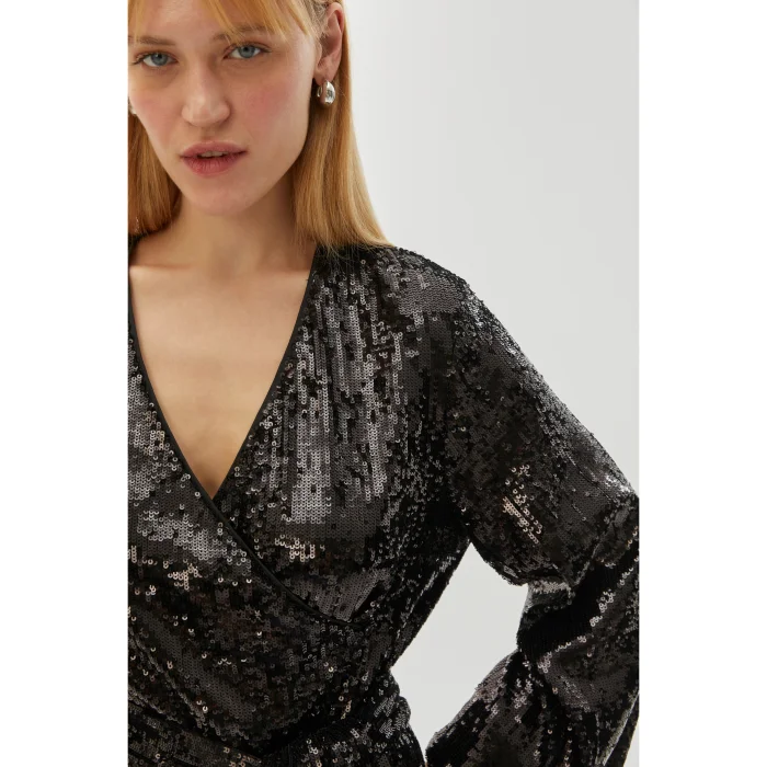Combining elegance and sparkle, the Sequined V-Neck Mini Regular Black Dress perfectly combines the elegance of black and the sparkle of sequins. The deep V-neck detail adds an air of sophistication to the dress, while the mini length and regular cut provide comfort. This dress is an ideal choice for special events and evening parties.