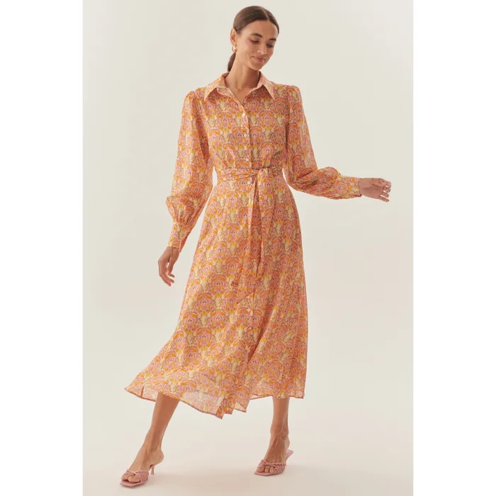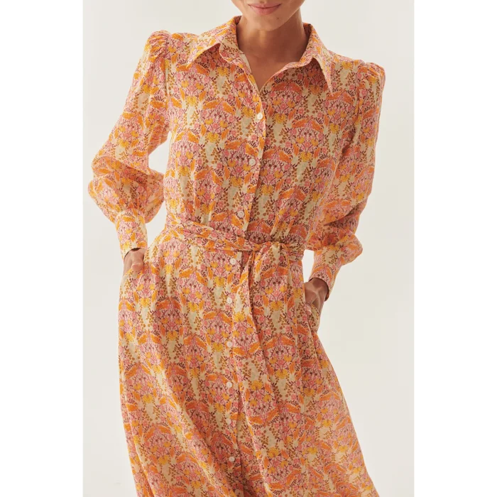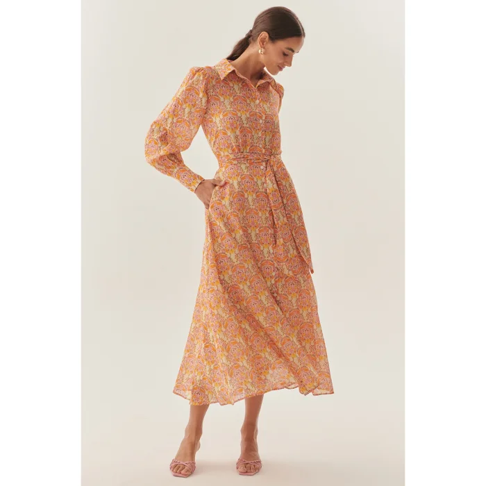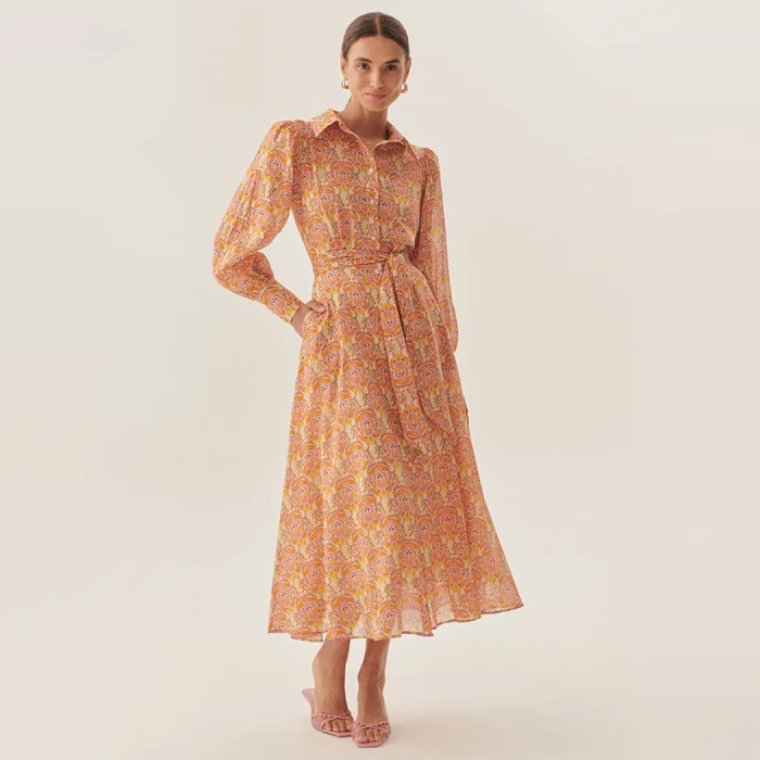 Product: Shirt Collar Long Sleeve Sash Detailed Floral Patterned Midi Dress