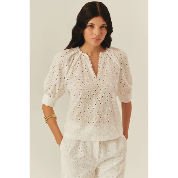 The most stylish interpretation of purity and romance! The elegant texture and breathable structure of the Fisto fabric make this blouse an indispensable part of the summer months. The V-neck detail offers a modern and feminine touch, while the relaxed fit allows you to move freely. This blouse, which can accompany every moment from daily combinations to holiday elegance, blends effortlessly with linen trousers, denim shorts or light skirts. A minimal, spacious and timeless piece for those who love the elegance of natural textures!