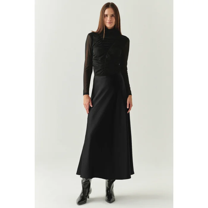 This midi skirt, which draws an elegant line with its soft flowing fabric and high waist cut, is easily worn with its side zipper; Thanks to its simple form, it accompanies an evening invitation with a silk blouse and a sunny weekend breakfast with a basic t-shirt and sandals.