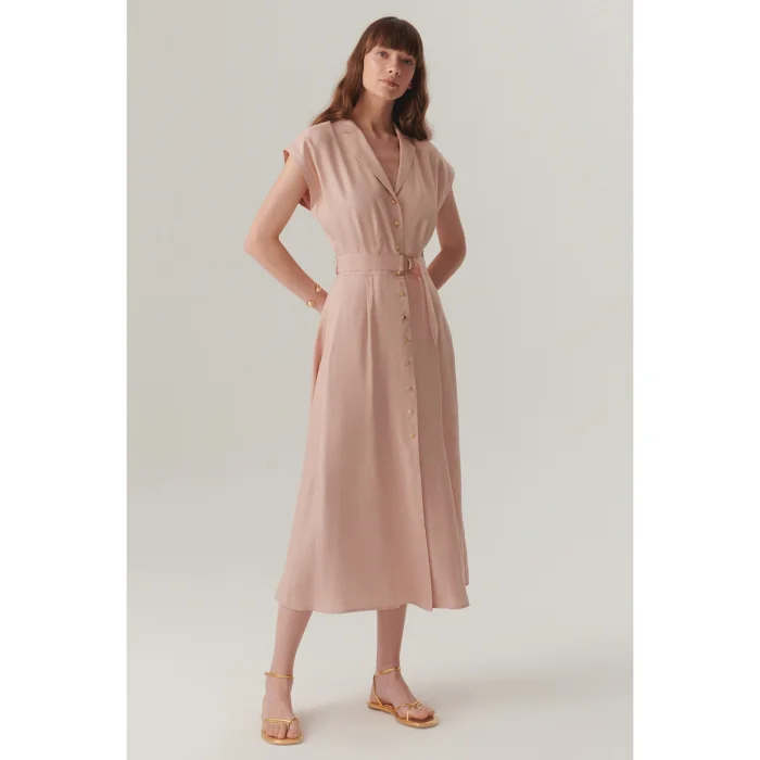 Product: Sleeveless Front Buttoned Fabric Belted Midi Pink Dress