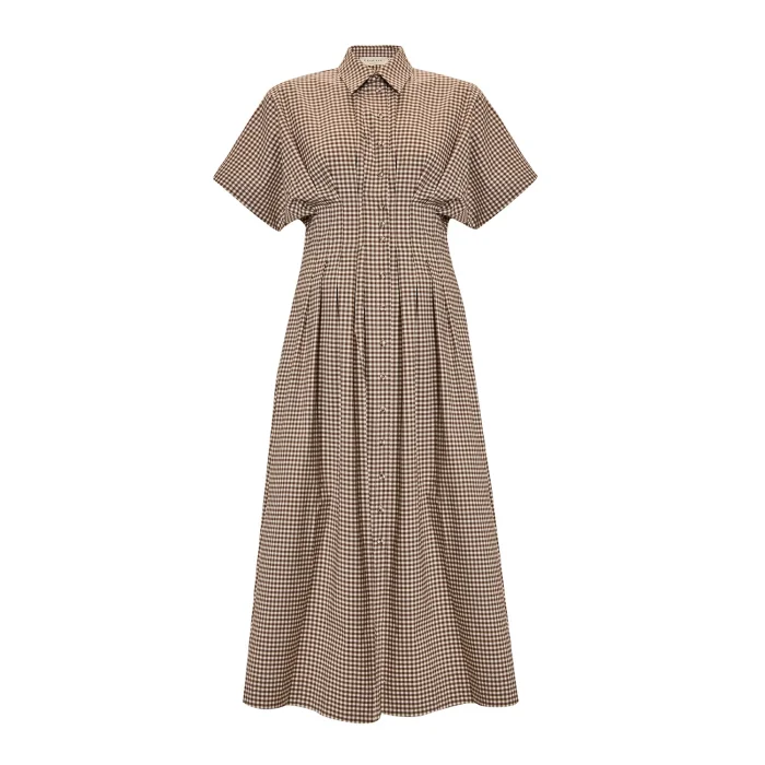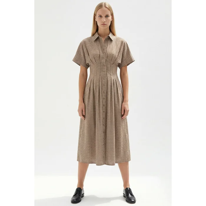 The natural draped structure of the soft-textured fabric, combined with the checkered pattern on the model, creates a very nostalgic and characterful look. Short sleeves that flare slightly down from the shoulders provide a relaxed and roomy silhouette, while subtle gathers wrap around the torso elegantly revealing the waistline. The button line running down the front completes the design with a classic and regular rhythm. The expanding form at the hem offers a fluid sense of movement with every step, making the piece a timeless dress that can adapt to both casual and more elaborate combinations.