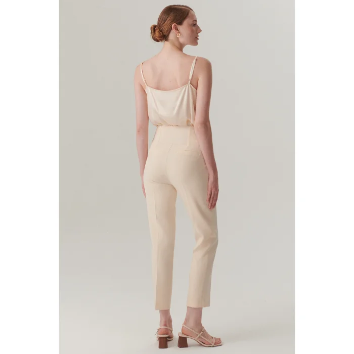 Designed with an elegant bone tone, these trousers add a modern touch to the simple stance with their special detail at the back waist. Thanks to its straight-leg cut and regular fit, it adapts to both office style and city combinations, while leaving a minimalist elegance with its pocketless design. Offering comfort all day long with its certified fabric content and comfortable form, this piece is a candidate to be one of the classic complements of your wardrobe.